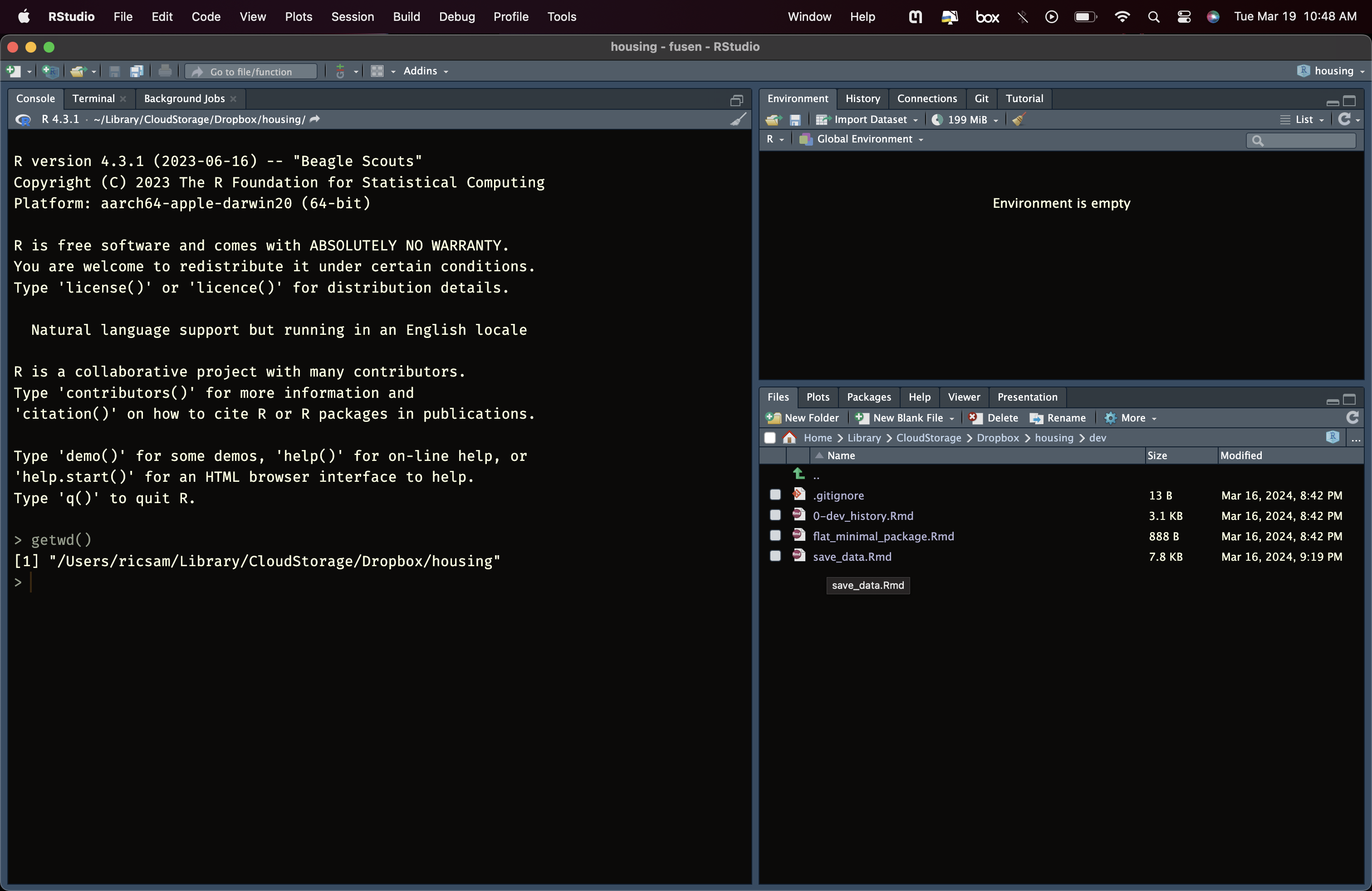.Rmd files: save_data.Rmd and analyse_data.Rmd.Rmd fileanalyse_data.Rmd to save_data.Rmdrmd branch (git checkout rmd) and create a branch called fusen (git checkout -b fusen){fusen} flat template in a dev/ folderStart a fresh R session inside the housing/ folder, and run this code: