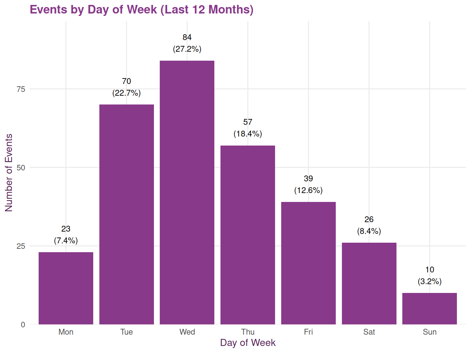 Wed is the most popular day with 84 events (27.2%). Weekend events represent 11.7% of all events.