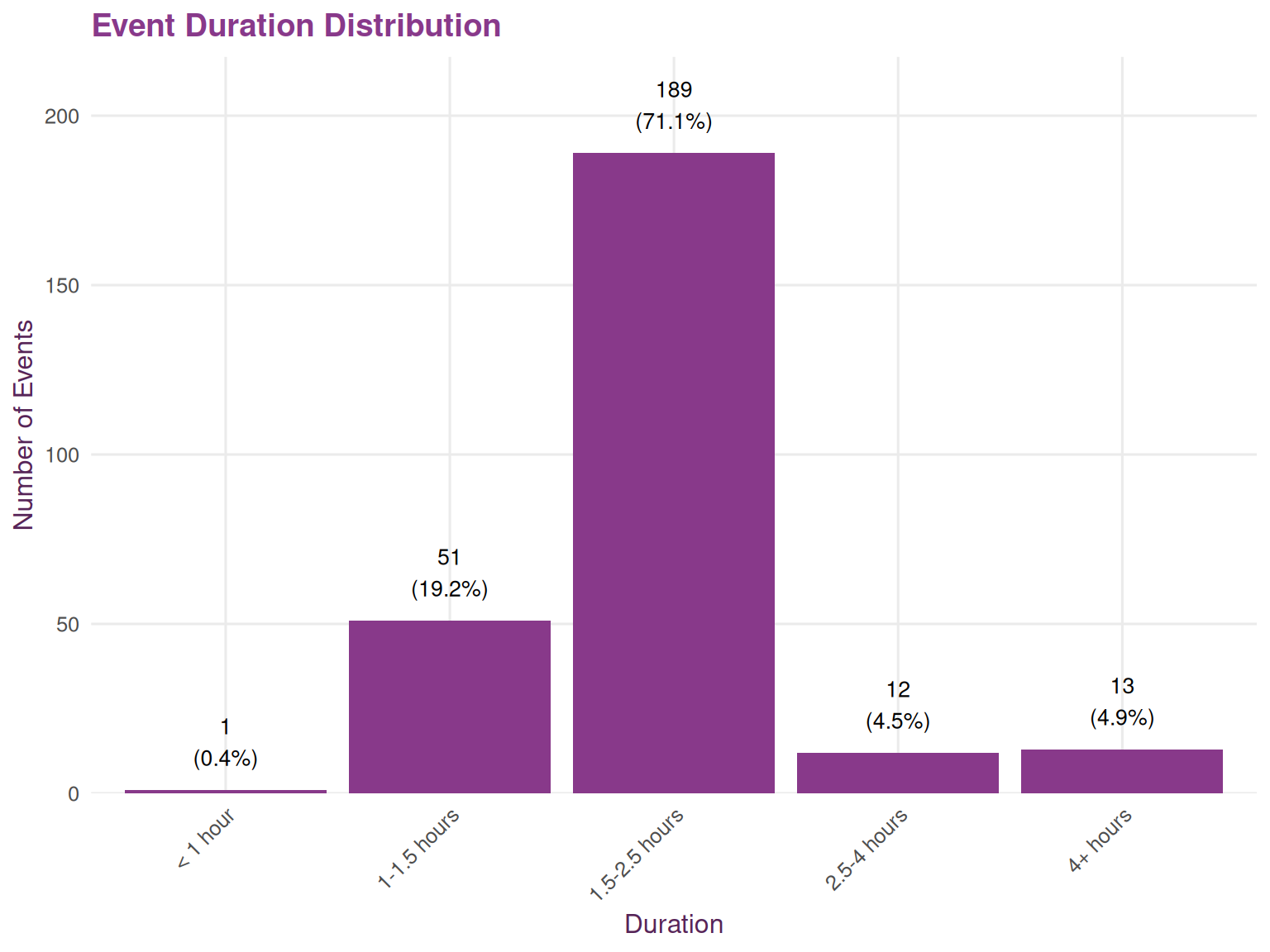 The most common duration is 1.5-2.5 hours (189 events, 71.1%). Median: 1.5 hours, mean: 1.9 hours.