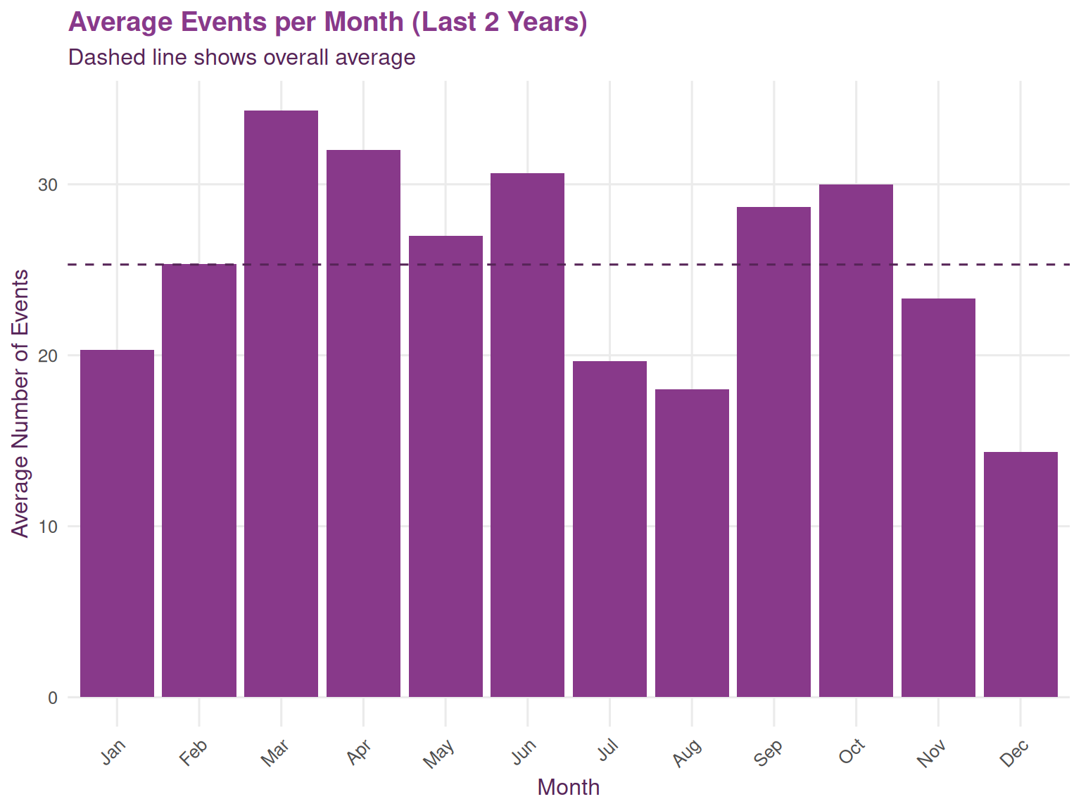 Mar is the busiest month (avg: 34.3 events) while Dec is the quietest (avg: 14.3 events).