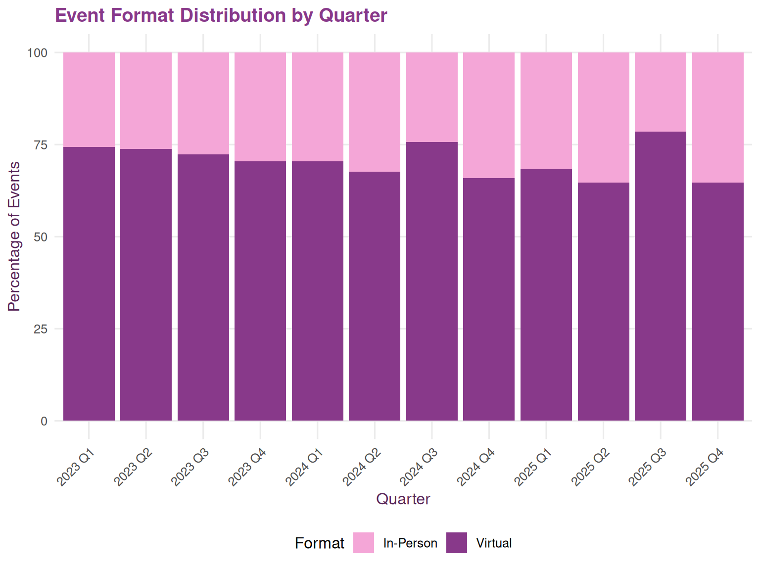 - Virtual events: Greater accessibility, easier speaker recruitment, weather-independent