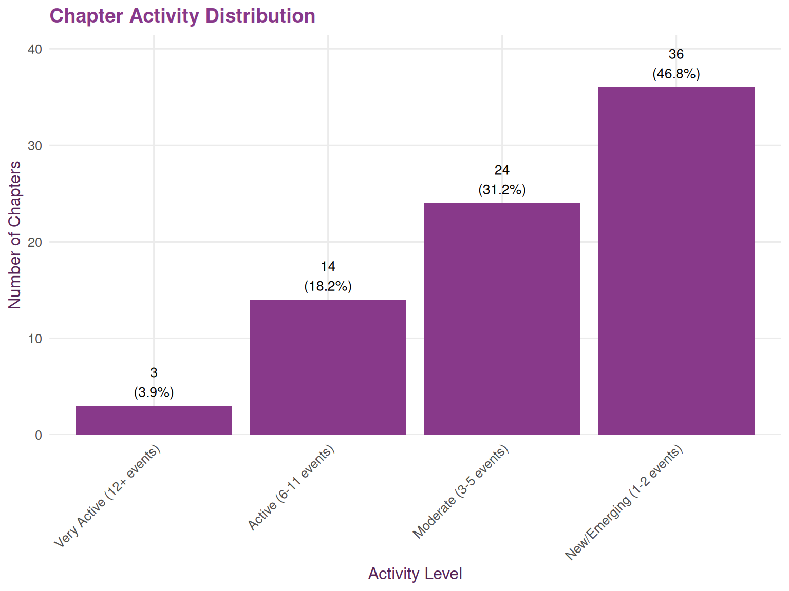 3 chapters hosted 12+ events (monthly or more frequent), demonstrating strong community engagement. 17 chapters maintained regular programming with 6+ events throughout the year.