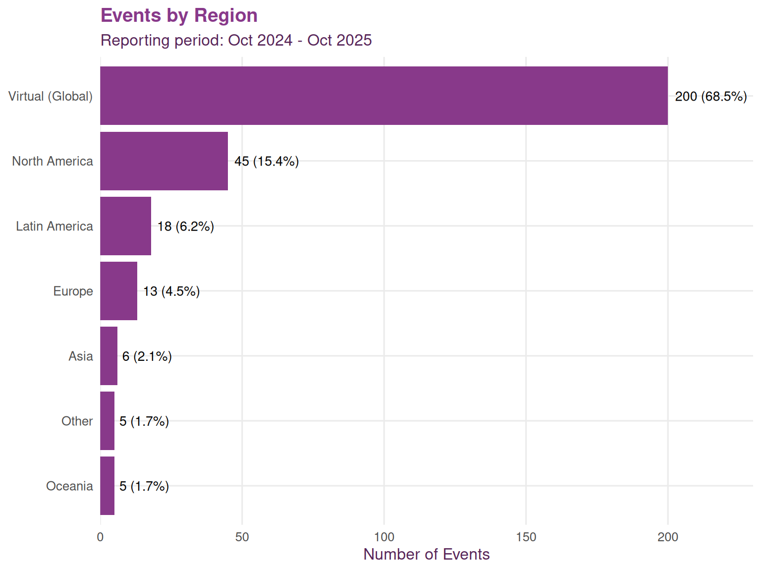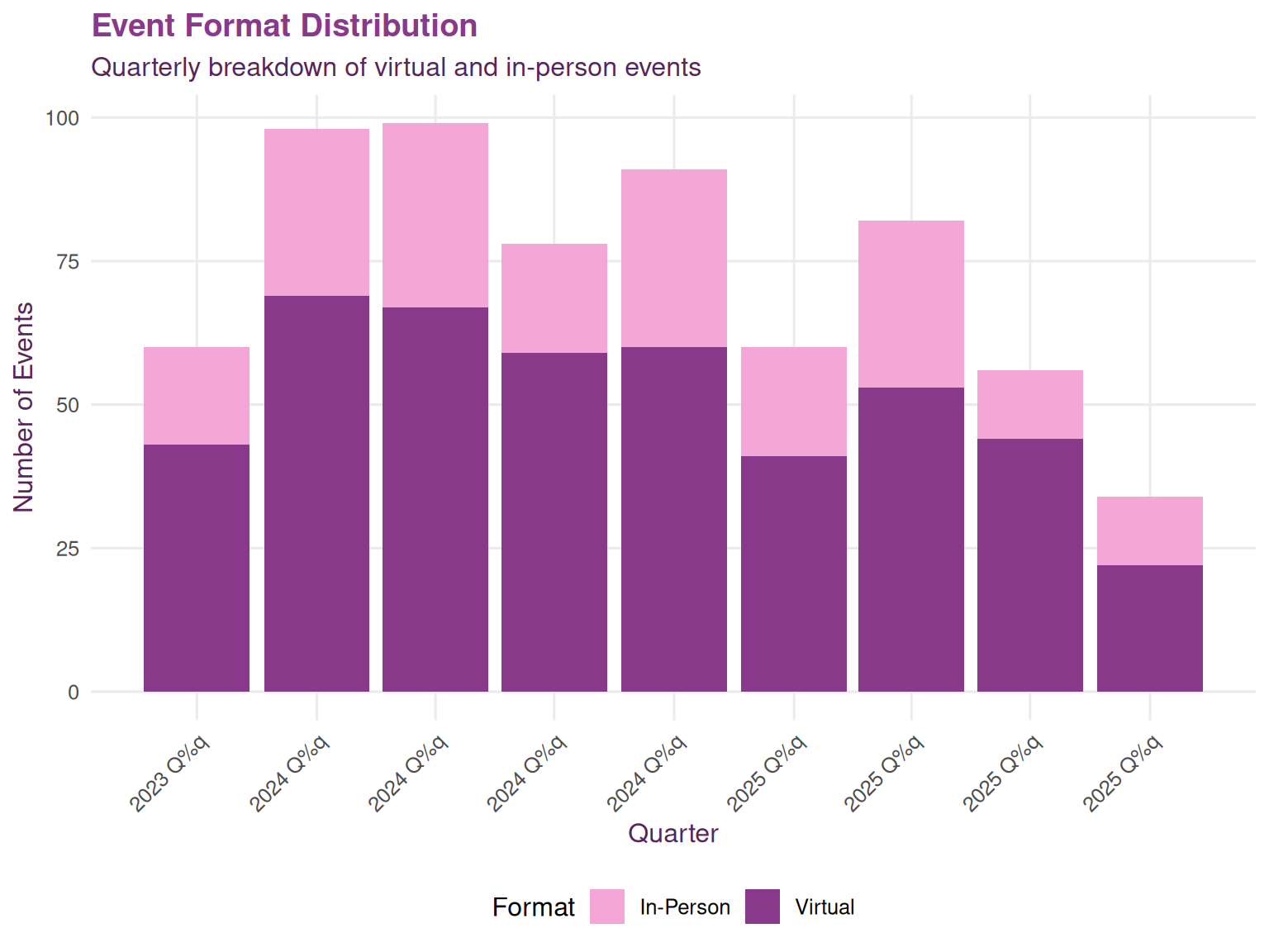 Virtual events comprise 68.5% of all events, ensuring accessibility for members regardless of location or mobility constraints.