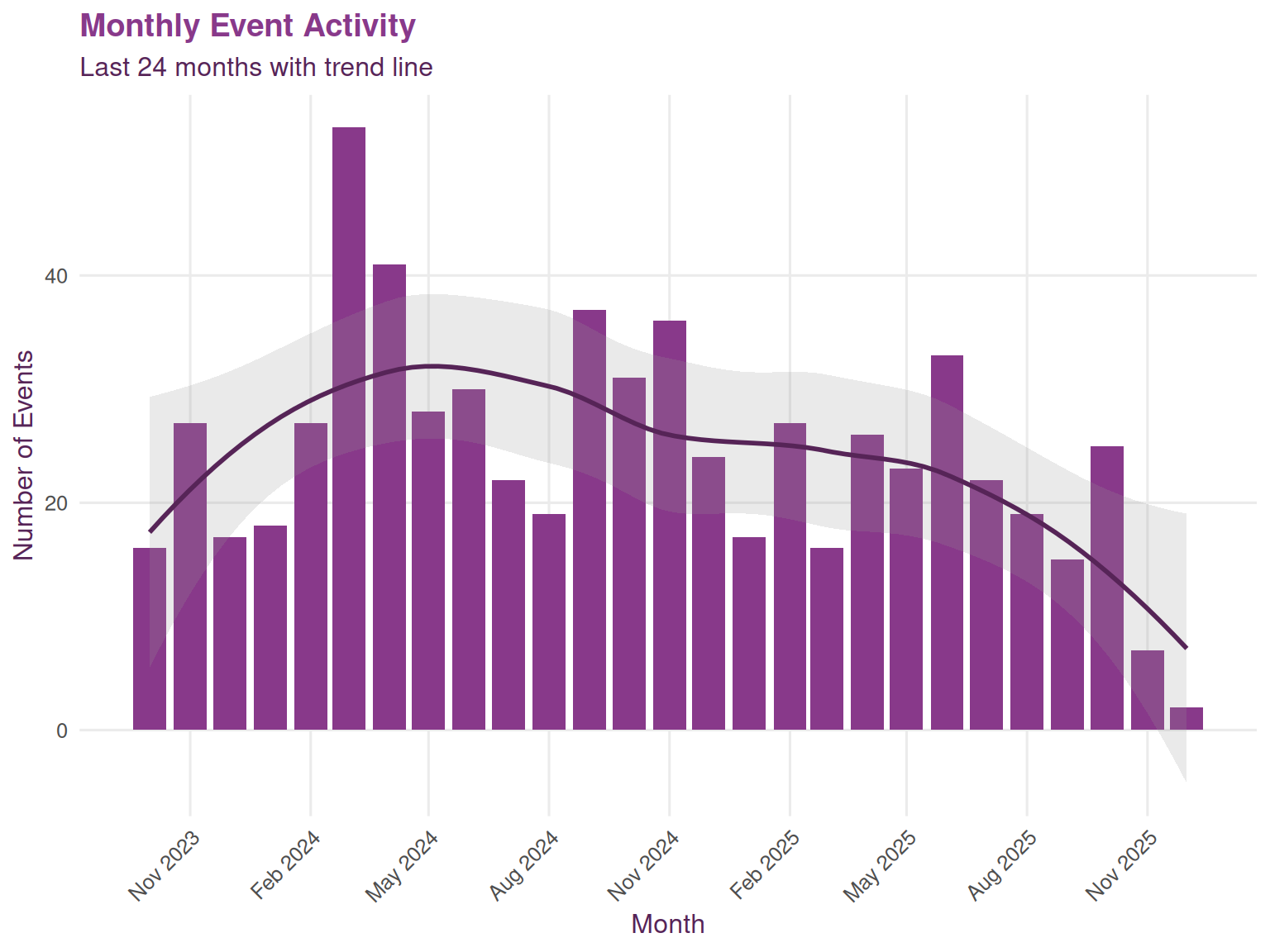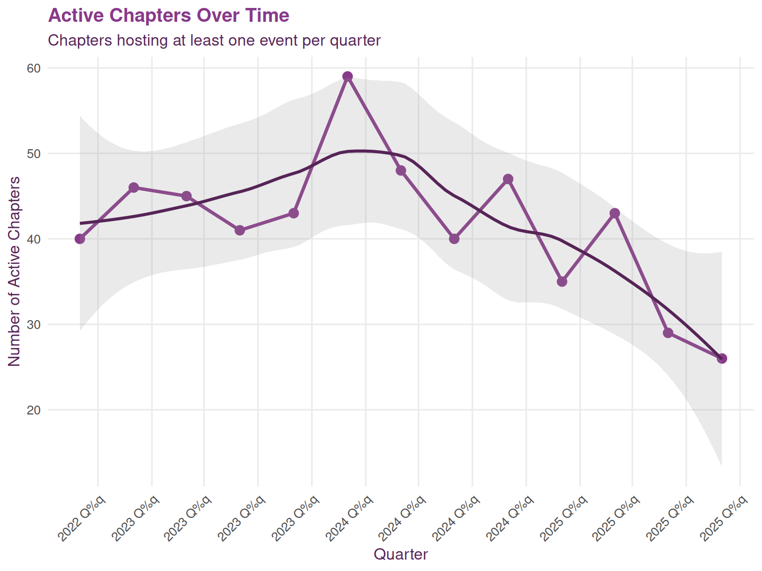 3 chapters hosted 12+ events (monthly or more frequent), demonstrating strong community engagement. 17 chapters maintained regular programming with 6+ events throughout the year.