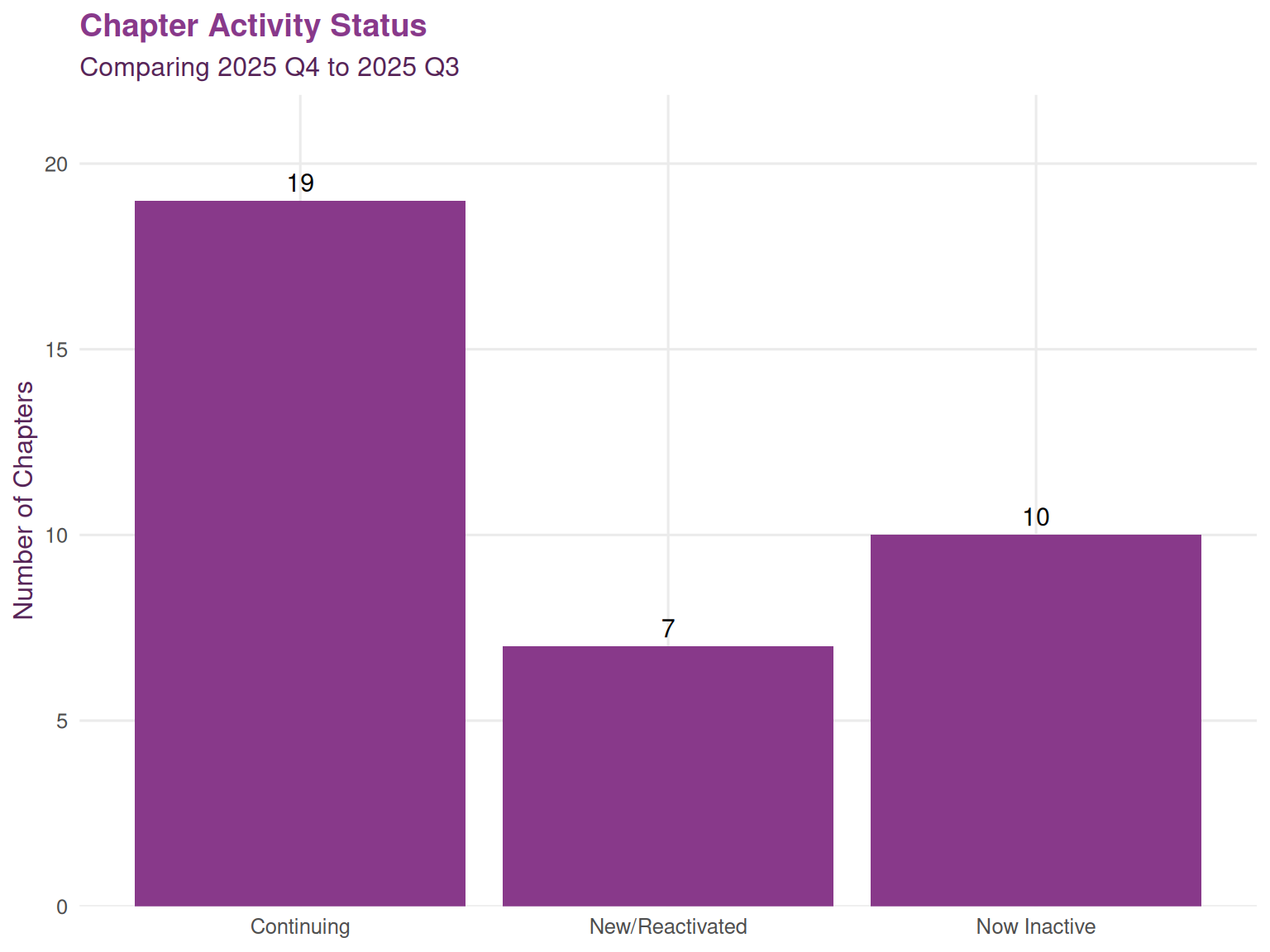 - New chapter onboarding: Provide resources to 7 new/reactivated chapters