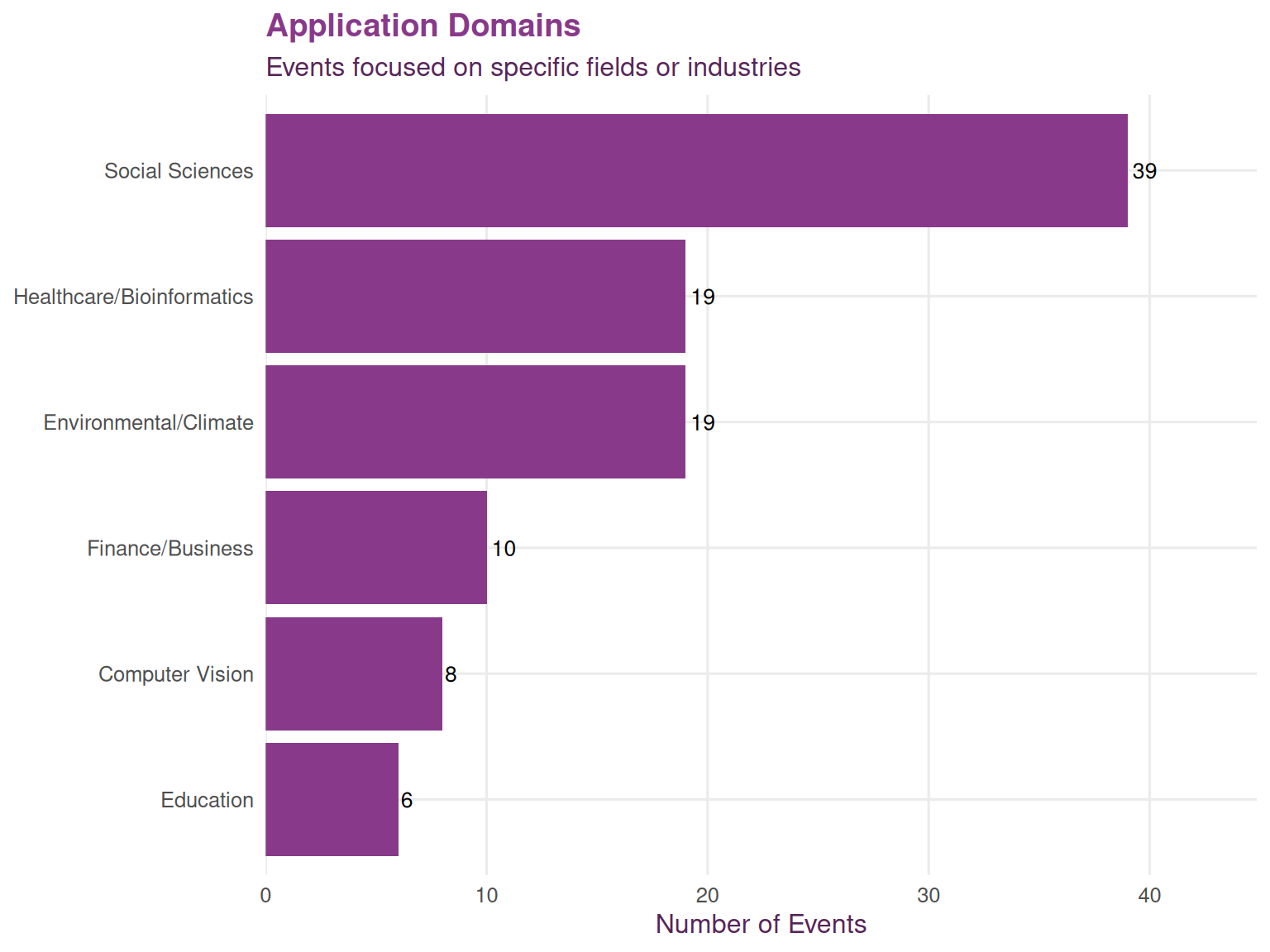The distribution of domain-specific content reflects both the professional backgrounds of organizers and members, as well as intentional outreach to different fields. Domains with fewer events may represent growth opportunities for targeted programming.