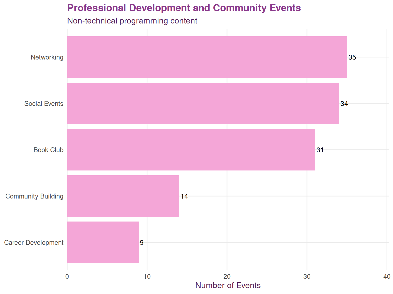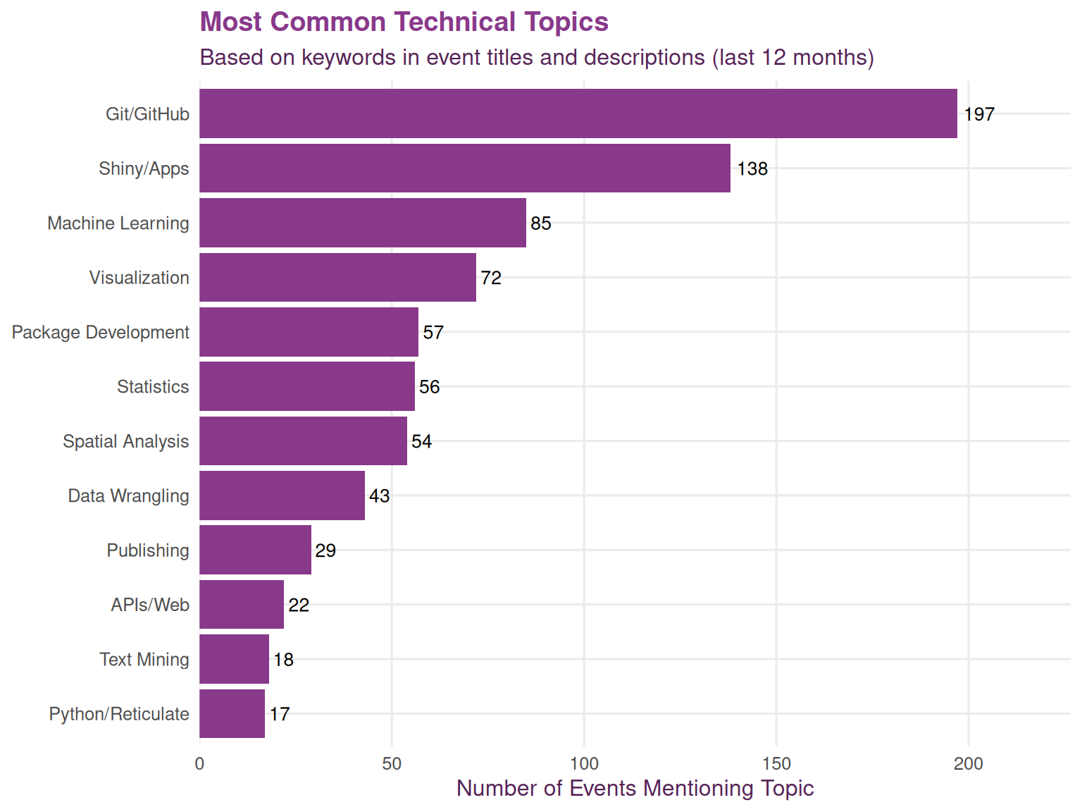 We identified technical topics by searching for relevant keywords in event titles and descriptions. This gives us insight into which R-related skills and tools are most frequently covered across the network.