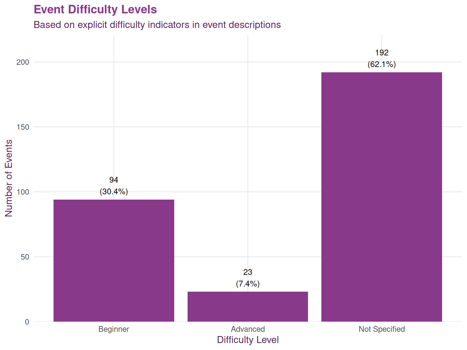 Events explicitly labeled as beginner-friendly (94 events, 30.4%) signal welcoming spaces for newcomers. The large number of unspecified events suggests an opportunity for organizers to more clearly communicate target audience levels.