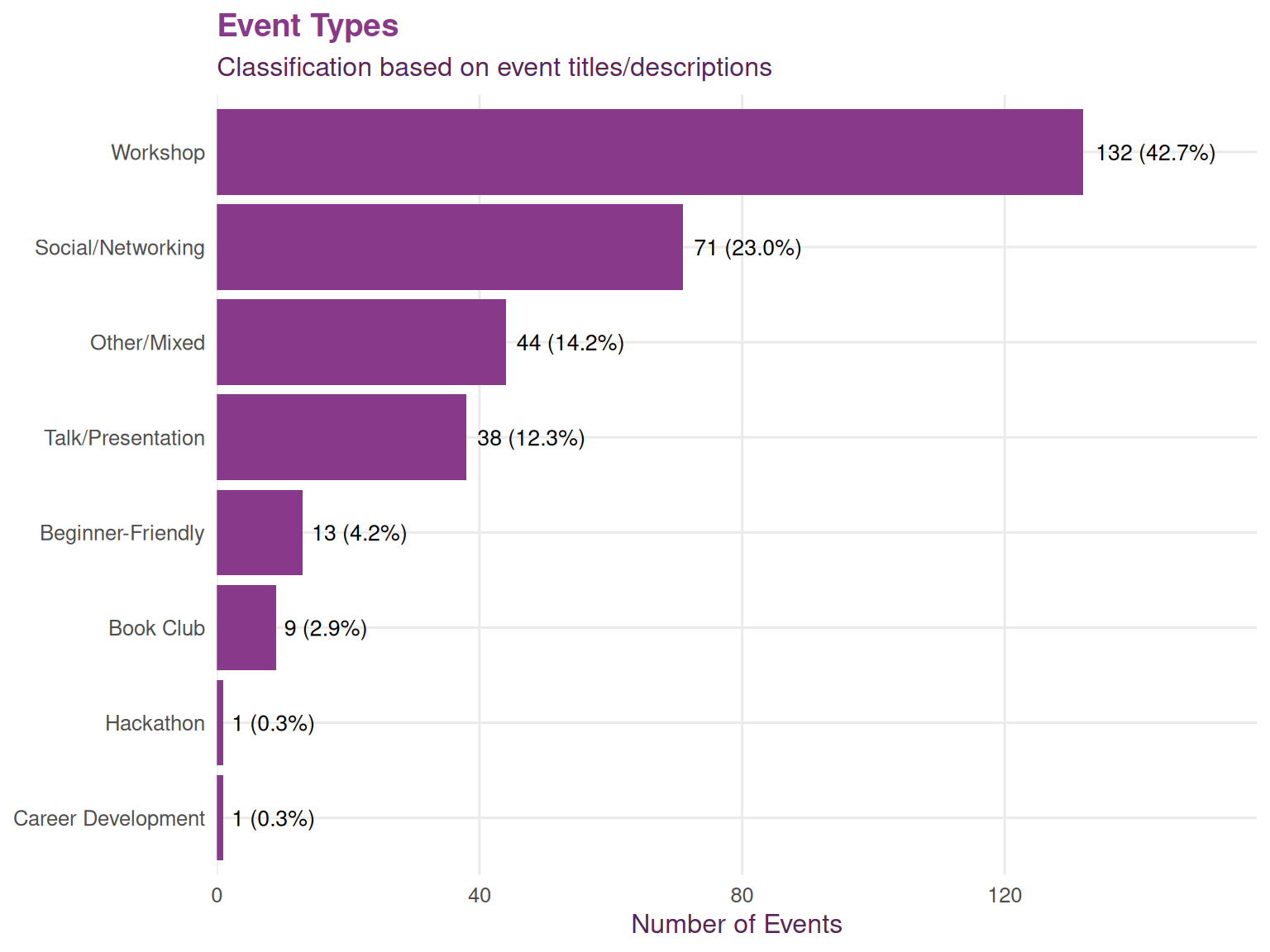 Understanding the balance of event types helps organizers assess whether they’re offering appropriate variety. A healthy mix typically includes technical learning opportunities alongside community-building activities.