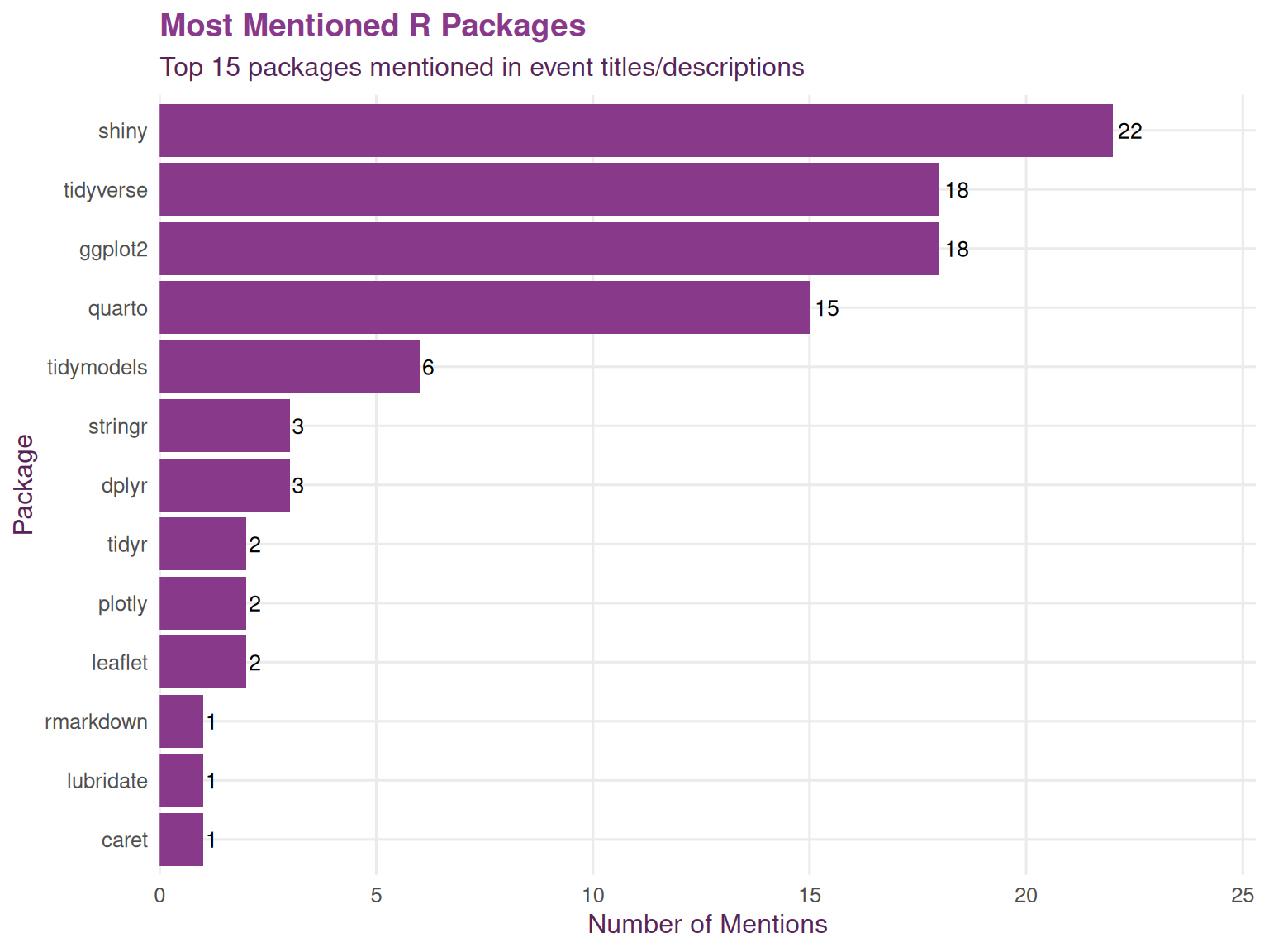 Package mention frequency often correlates with package popularity in the broader R community, but also reflects what topics organizers feel confident teaching. Core tidyverse packages typically dominate due to their fundamental role in R workflows.