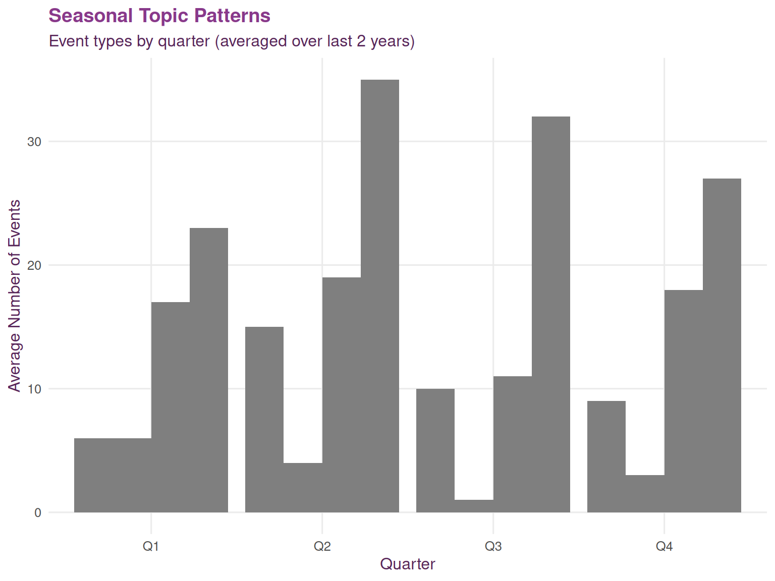 Event topics may vary by time of year, influenced by academic calendars, conference schedules, and holiday patterns. Understanding seasonal rhythms helps with strategic event planning.