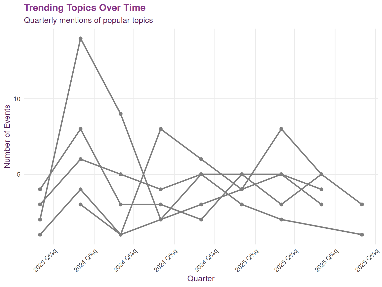These trend lines reflect both the introduction of new tools (like Quarto) and sustained interest in established frameworks (like tidyverse and Shiny). Rising trends may indicate topics worth featuring more prominently, while declining trends might suggest saturation or shifting community needs.